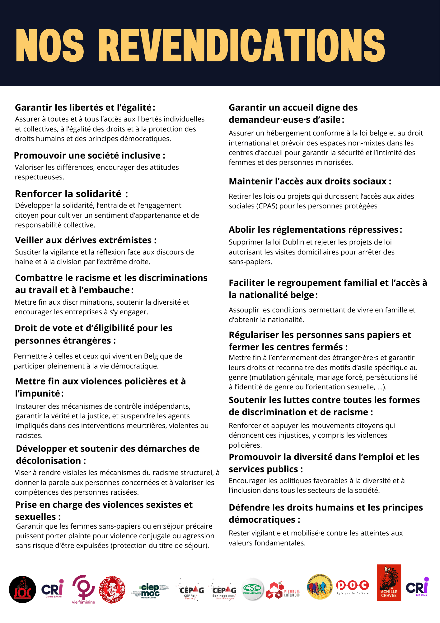 Plateforme 21 mars Mons-La Louvière composé par: JOC Mons-Borinage, Marche des migrants de la Région du Centre, Picardie Laïque, PAC Régionale du Centre, CEPAG Mons-Borinage, Moc Hainaut Centre.